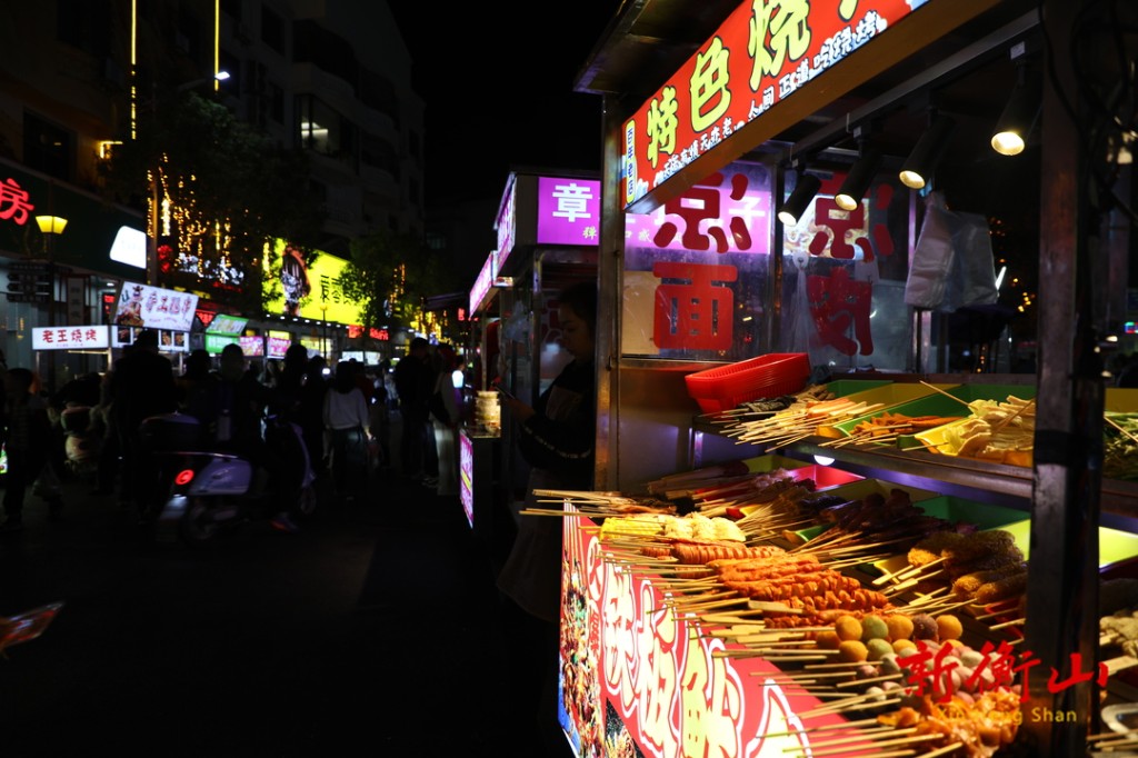 夜幕降临,华灯初上。群英夜市美食街人头攒动,霓虹璀璨,醒目的灯箱与绕树灯饰在升腾的烟火气中,装点着衡山热闹又鲜活的夜晚。