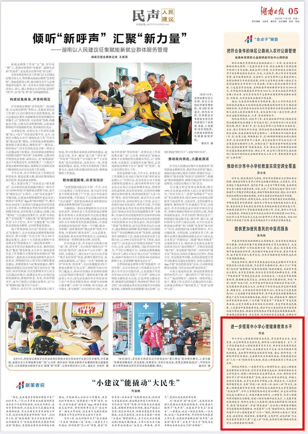 中小学生心理健康问题日益凸显,学生因学业压力、家庭矛盾、社交障碍等引发的焦虑、抑郁等心理问题增多。当下,中小学校普遍存在心理健康教育资源不足、部分家长和教师存在"重成绩、轻心理"倾向、社会服务体系不完善、校内外联动干预机制缺失、危机事件预防能力较弱等问题。建议:衡阳市进一步强化师资队伍建设,完善课程体系和硬件设施,积极构建家校社"三位一体"的协同育人机制,促进心理健康教育工作再上新台阶。