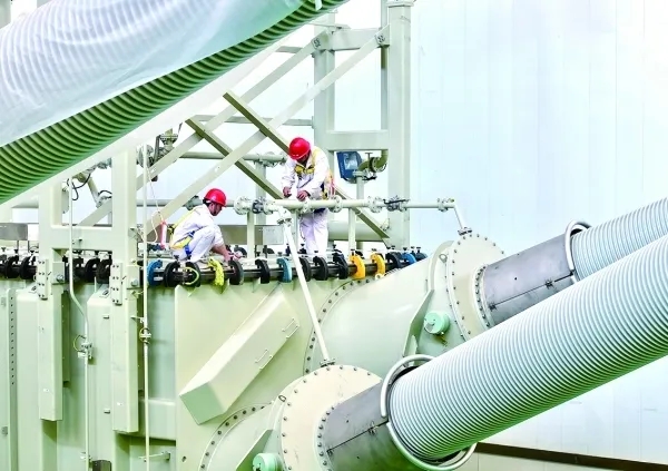 在特变电工衡变公司生产车间内,工作人员对“宁电入湘”衡阳站±600千伏