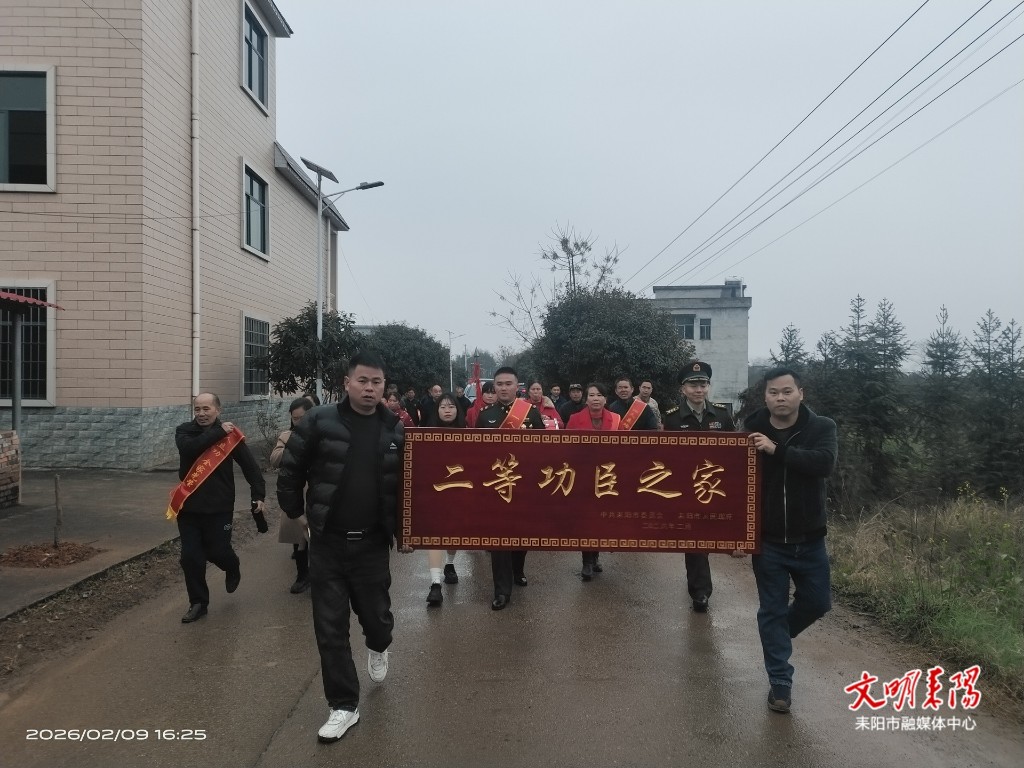 耒阳融媒2月10日讯(记者 江维东)锣鼓喧天传喜讯,锦旗映彩耀门庭。2月9日,暖意融融,耒阳市委常委、市人武部政委廖伟林,副市长伍检告带队到南京镇白毛村,为荣立二等功的现役军人贺胜广送上喜报、牌匾和关怀,让功臣家庭共享荣光,让尊崇军人的暖流浸润乡村。