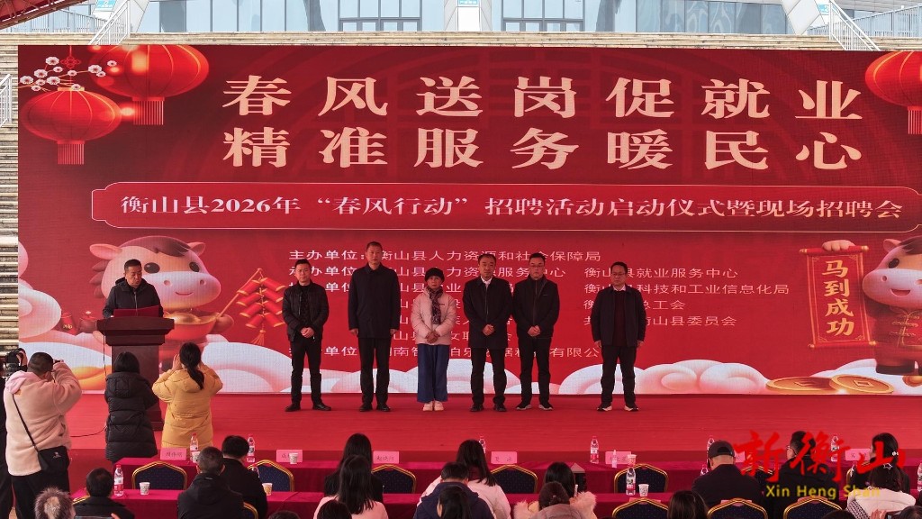 新年伊始,春风送暖。2月12日上午,衡山县2026年“春风行动”招聘活动启动仪式暨现场招聘会在县体育馆前坪举行,拉开新一年稳就业、保民生、促发展的序幕。县委常委、常务副县长夏冰,县领导赵晓阳、胡文星参加。