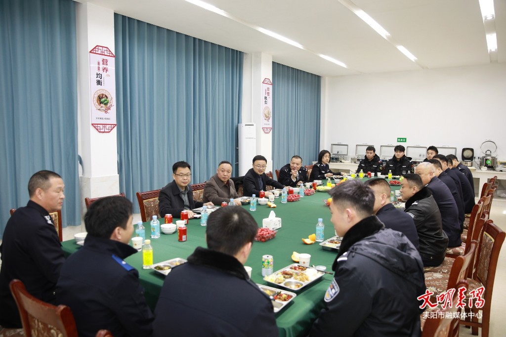 “大家辛苦了。”在市公安局,张润槐走进情指行一体化实战中心、侦查实战中心、反诈中心等地,通过视频系统连线基层派出所干警,详细了解春节期间值班备勤、巡逻防控、交通疏导、治安管控等情况,并同值班民辅警在机关食堂共进午餐、共贺新春。张润槐说,过去一年,全市公安队伍冲锋在前、连续奋战,打赢了一场场硬仗,耒阳社会大局总体平安稳定、群众满意。希望大家再接再厉、坚守岗位,发挥好公安干警旗帜和标杆作用,全力做好保畅通、保安全各项工作,齐心协力为耒阳平安战斗到底,用“辛苦指数”换取人民群众的“安全指数”和“幸福指数”。