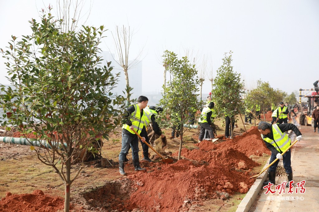 植树现场,大家三人成组、五人成团分工协作,挥锹铲土、扶正树苗、回填压实、提水浇灌,合力栽下一株株梧桐树、樟树等。经过一上午的劳作,百余株新栽的苗木在沿江北路上迎风挺立,增添了勃勃生机。