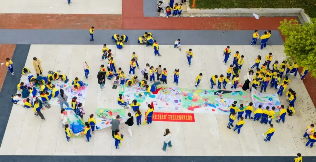 分散创作的九块画布被精心拼接,一幅主题鲜明、充满想象力的巨型画作完整呈现。全体师生围绕这幅共同完成的美育成果,留下了洋溢着成就感与喜悦的珍贵合影。