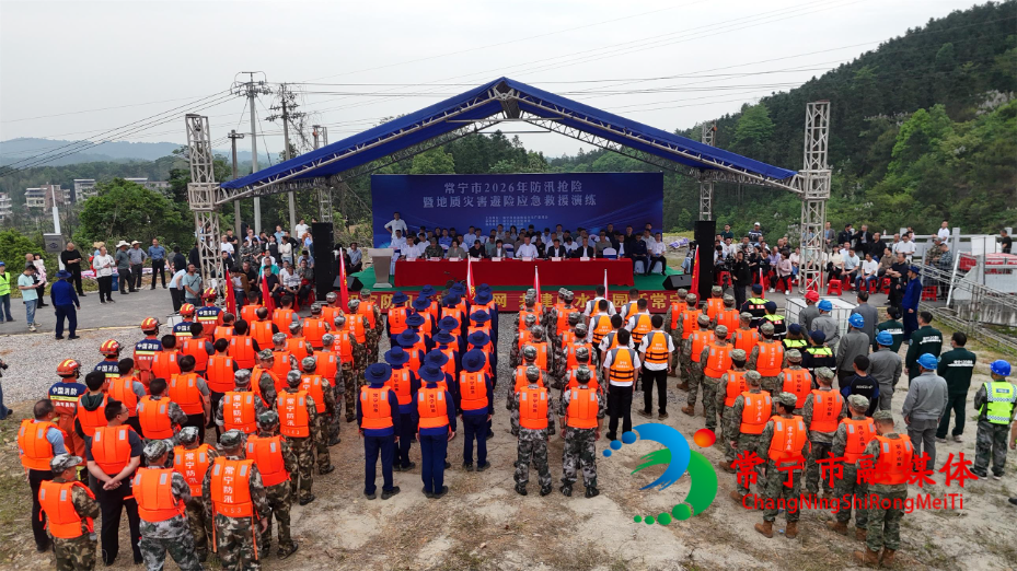 4月27日,常宁市组织开展2026年防汛抢险暨地质灾害避险应急救援演练。市委副书记、市长邓艳红到场观摩指导并宣布演练开始。
