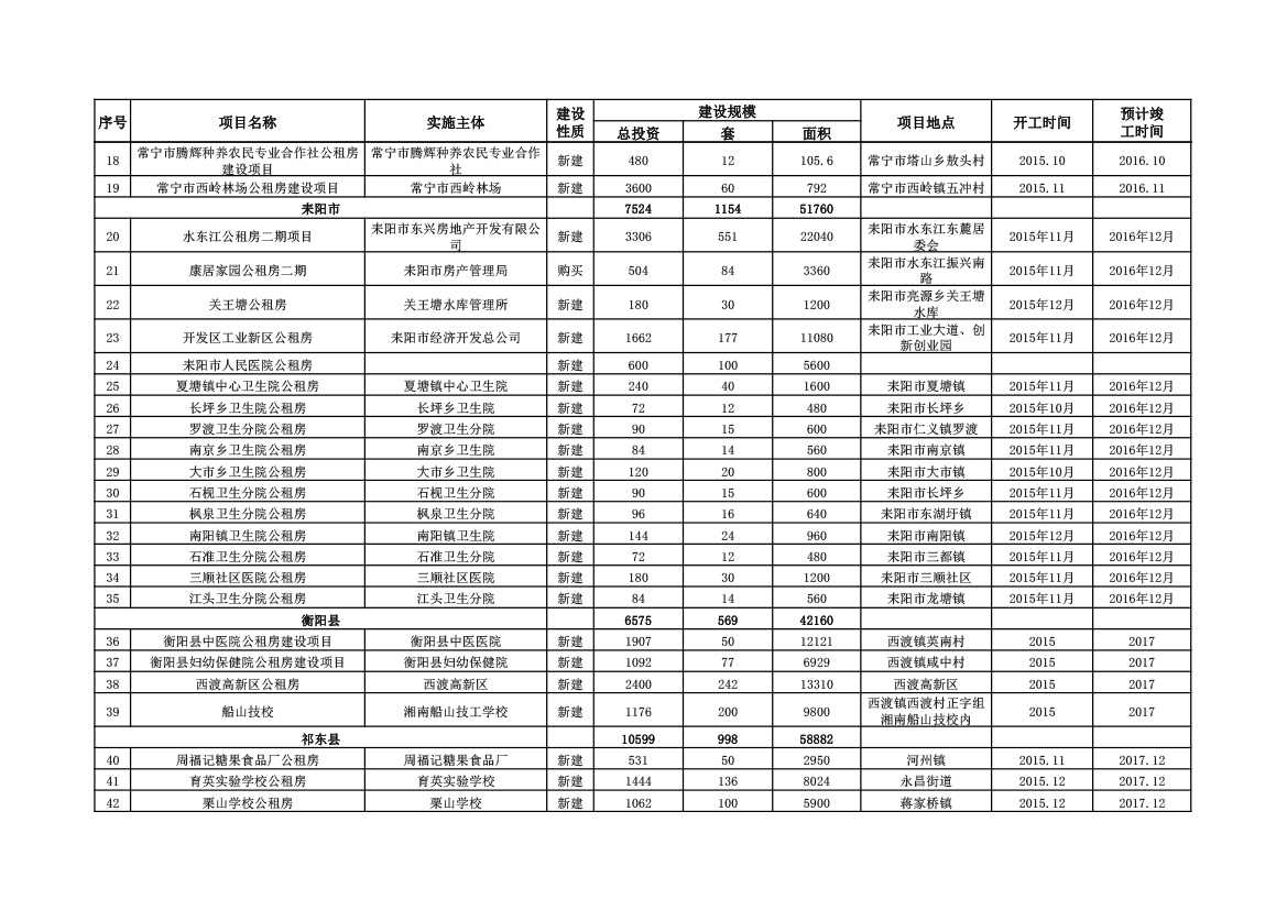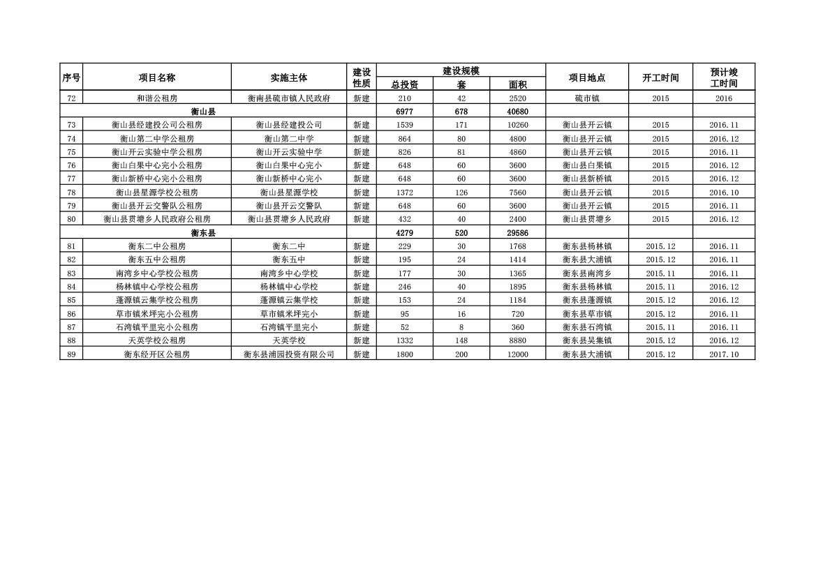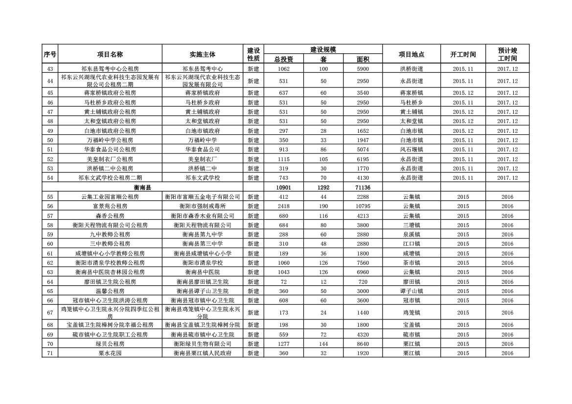 2015年衡阳市公共租赁住房超任务完成项目信息表