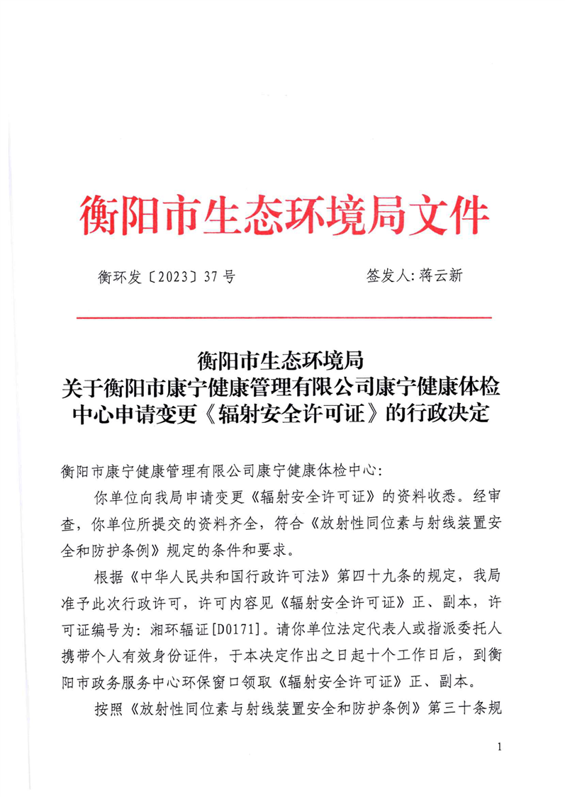 关于衡阳市康宁健康管理有限公司康宁健康体检中心申请变更《辐射安全许可证》的行政决定