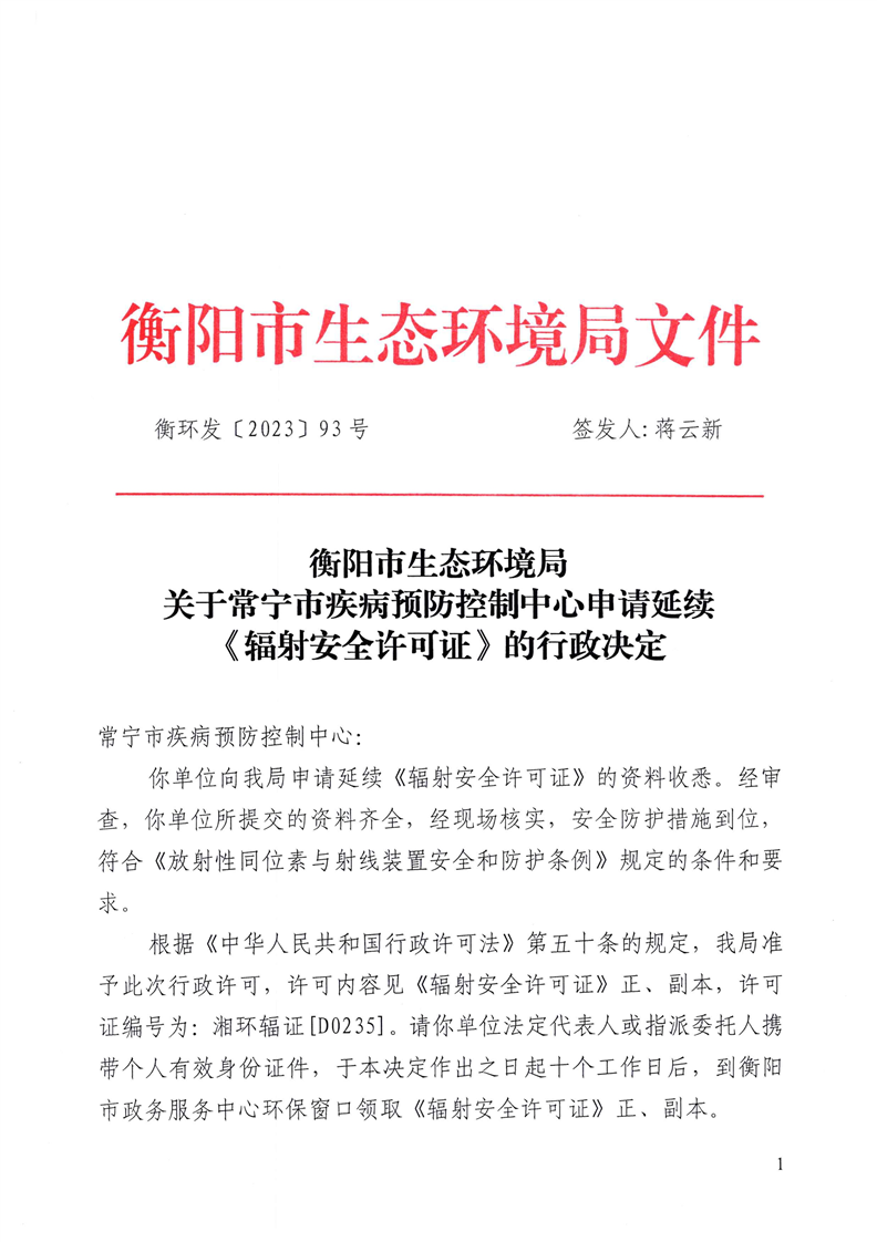 关于常宁市疾病预防控制中心申请延续《辐射安全许可证》的行政决定