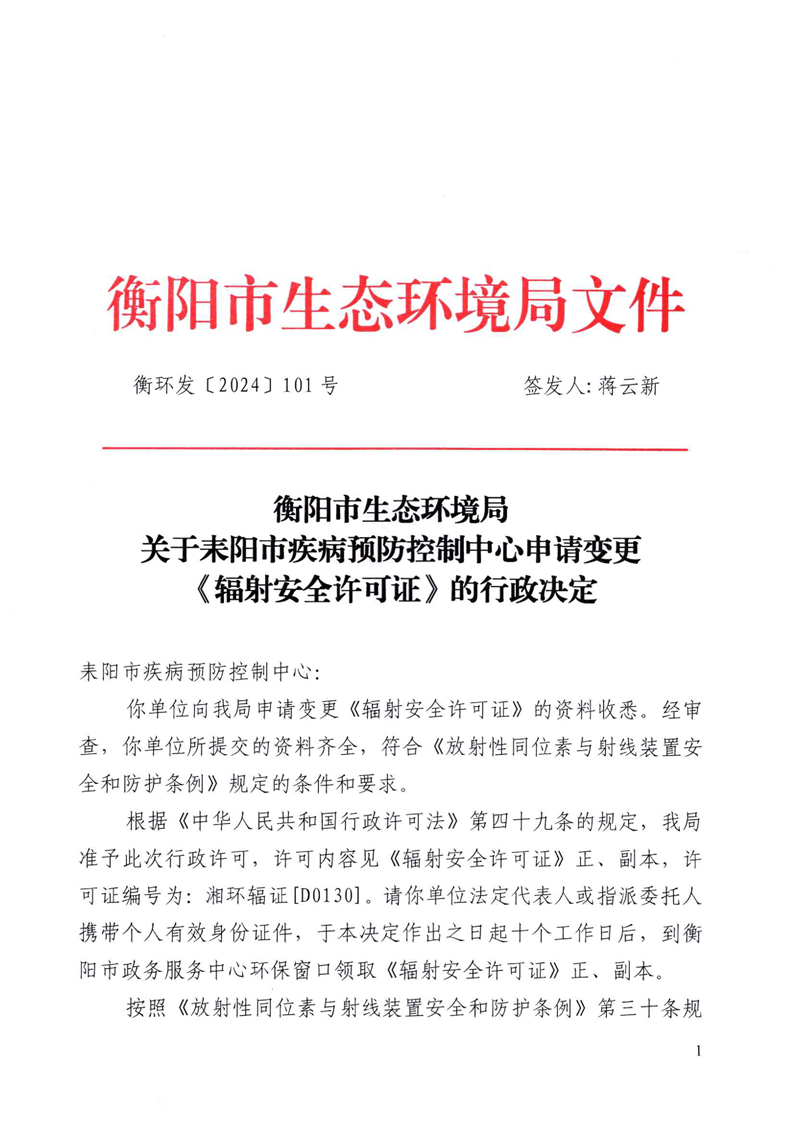 关于耒阳市疾病预防控制中心申请变更《辐射安全许可证》的行政决定