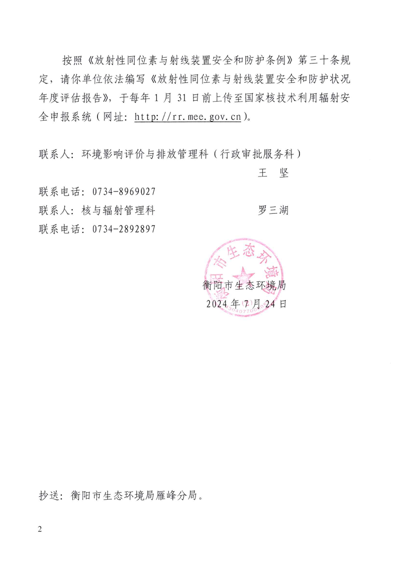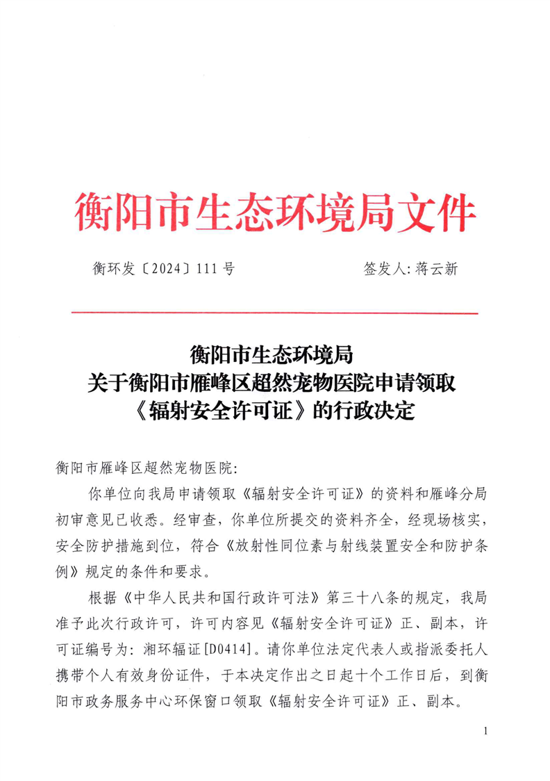 关于衡阳市雁峰区超然宠物医院申请领取《辐射安全许可证》的行政决定