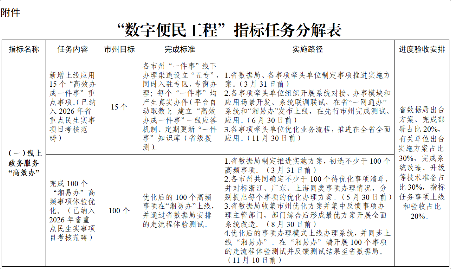 7.实施“数字便民工程”。以重点民生实事为牵引,着力推动线上政务服务“高效办”、线下窗口服务“集中办”、“AI+政务”“智慧办”、“信用+行政审批”“信易办”(指标任务分解表见附件)。