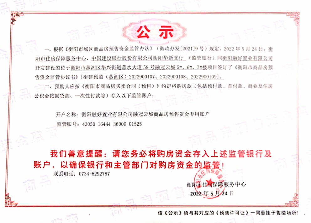 关于“融冠云城5#、6#7#楼”监管账户的公示