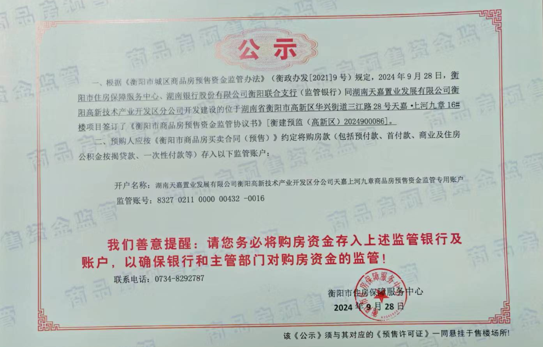 关于“天嘉·上河九章16#楼”监管账户的公示
