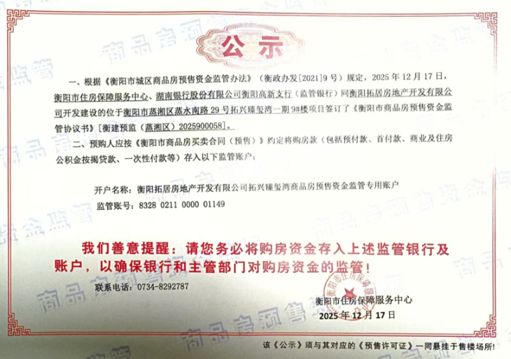 关于“拓兴臻玺湾一期9#楼”监管账户的公示