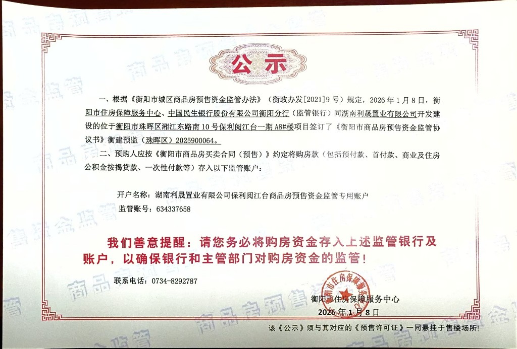 关于“保利阅江台一期A8#楼”监管账户的公示