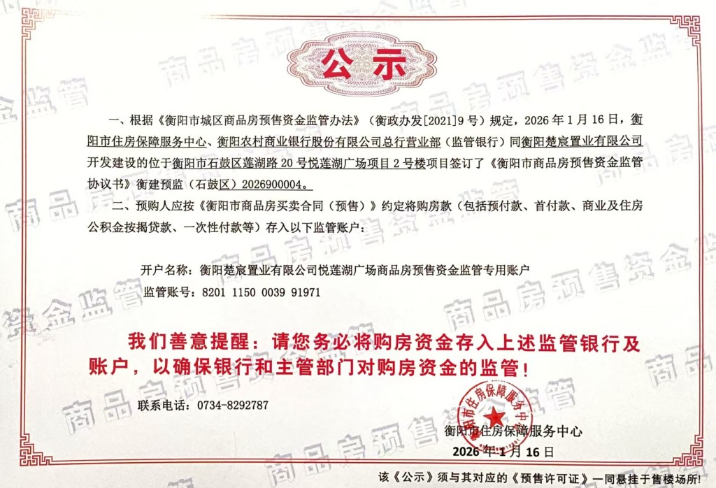 关于“悦莲湖广场项目2号楼”监管账户的公示