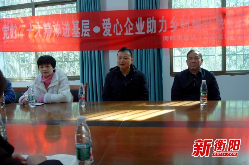 衡阳市质安站党委书记、站长邱晓东表示,党的二十大报告指出,全面推进乡村振兴。全面建设社会主义现代化国家,最艰巨最繁重的任务仍然在农村。质安站助力乡村振兴,不仅仅是出人还要出力出钱,还要发动更多爱心企业都来帮扶,宣传党的二十大精神,恳谈只是一种形式,关键在行动。邱晓东建议黄双村要注重发展乡村特色产业,发展新型农村集体经济,拓宽农民增收致富渠道。只有壮大集体经济,才能形成振兴合力。