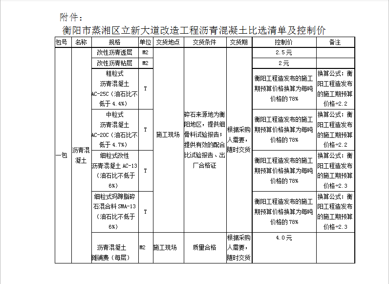 根据我司《关于颁发材料设备采购、机械设备租用、劳务、渣土运输等管理制度的通知》,拟对衡阳市蒸湘区立新大道改造工程所需沥青混凝土材料进行比选,比选方式为公开比选,比选公告发布在衡阳市住房和城乡建设局门户网,现就相关事项公告如下: