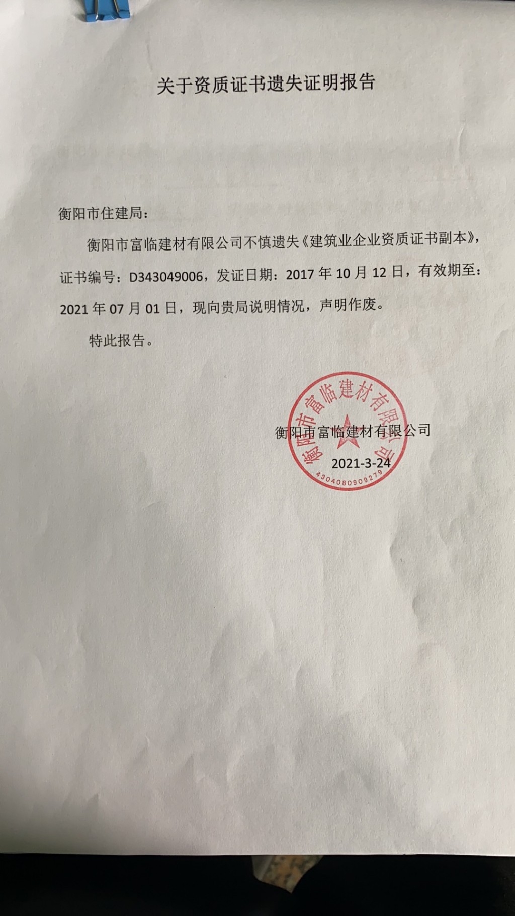 衡阳市富临建材有限公司不慎遗失《建筑业企业资质证书》,证书编号:D343049006 ,发证日期:2017年10月12日,有效期至:2021年07月01日,现声明作废。