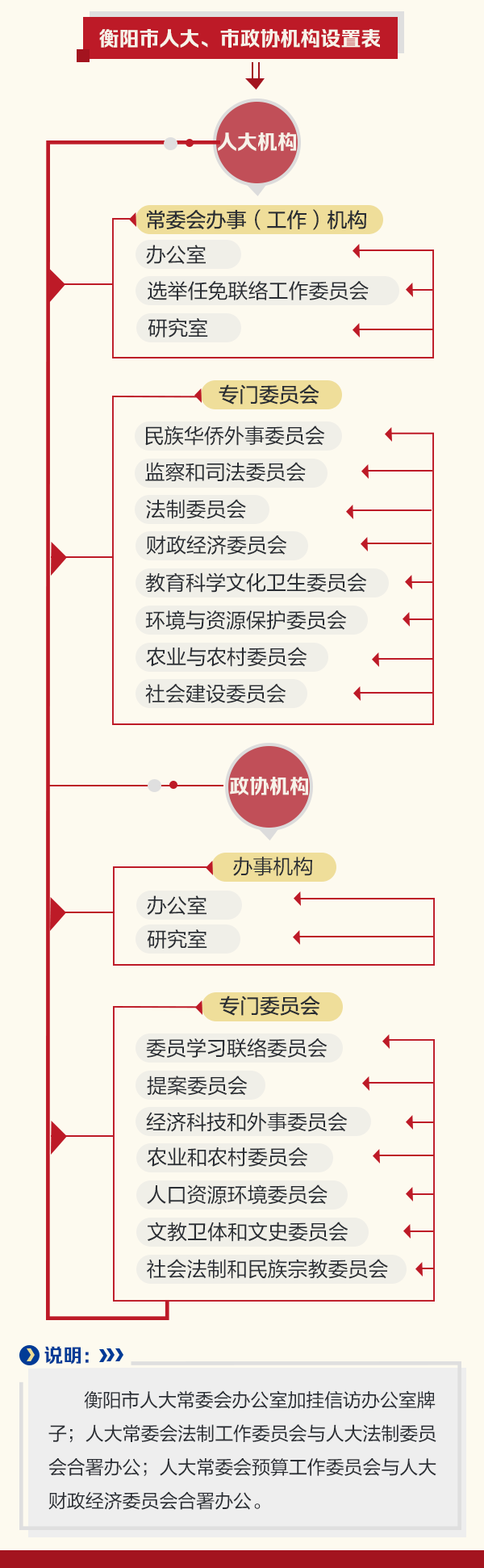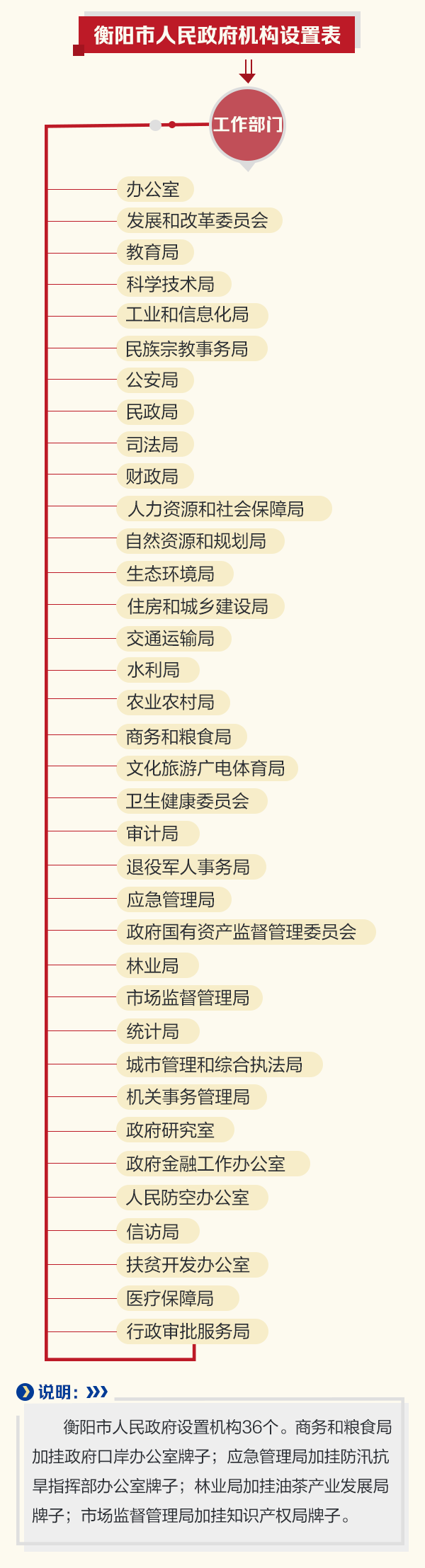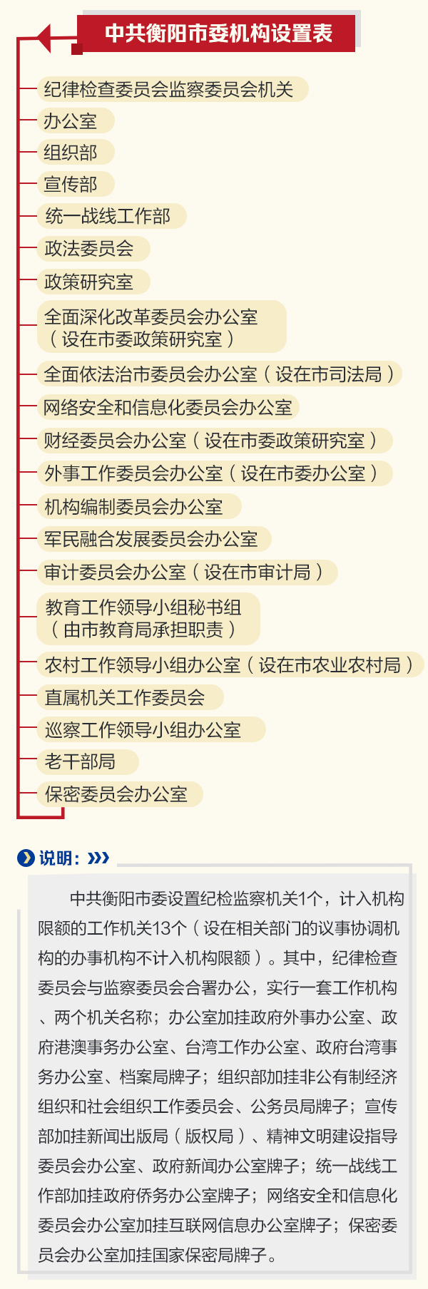 根据《中共湖南省委办公厅湖南省人民政府办公厅关于印发〈衡阳市机构改革方案〉的通知》(湘办〔2018〕59 号)精神,改革后衡阳市设置党政机构50个,其中,市委机构14个(纪检监察机关1个,工作机关13个),市政府工作部门36个。市人大常委会设置办事机构、工作机构3个,市人大设置专门委员会8个。市政协设置办事机构2个,专门委员会7个。