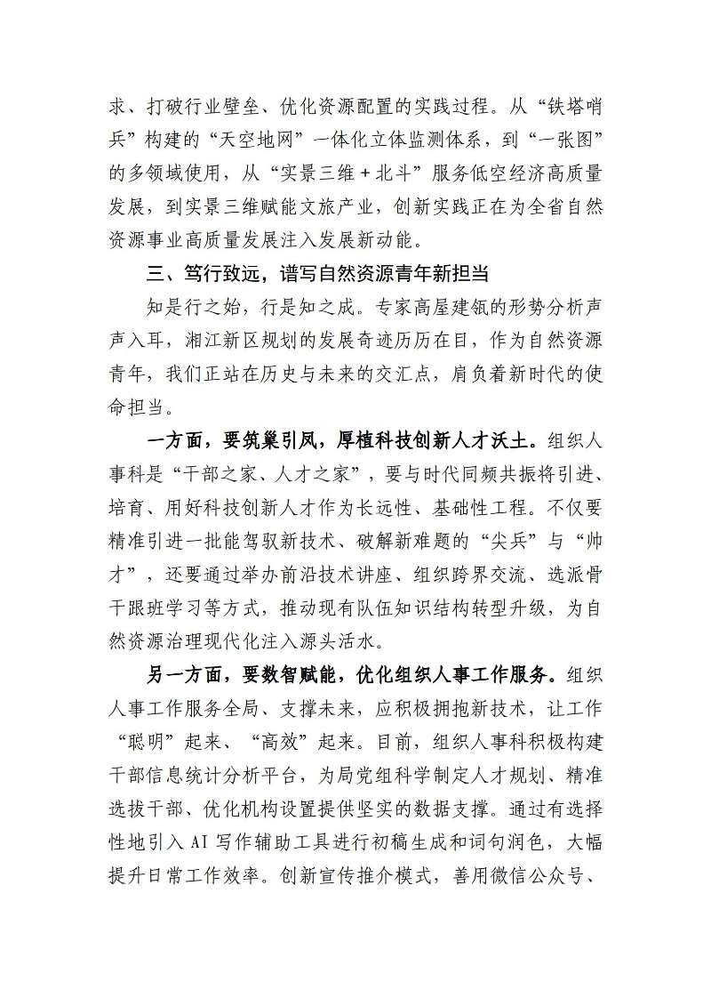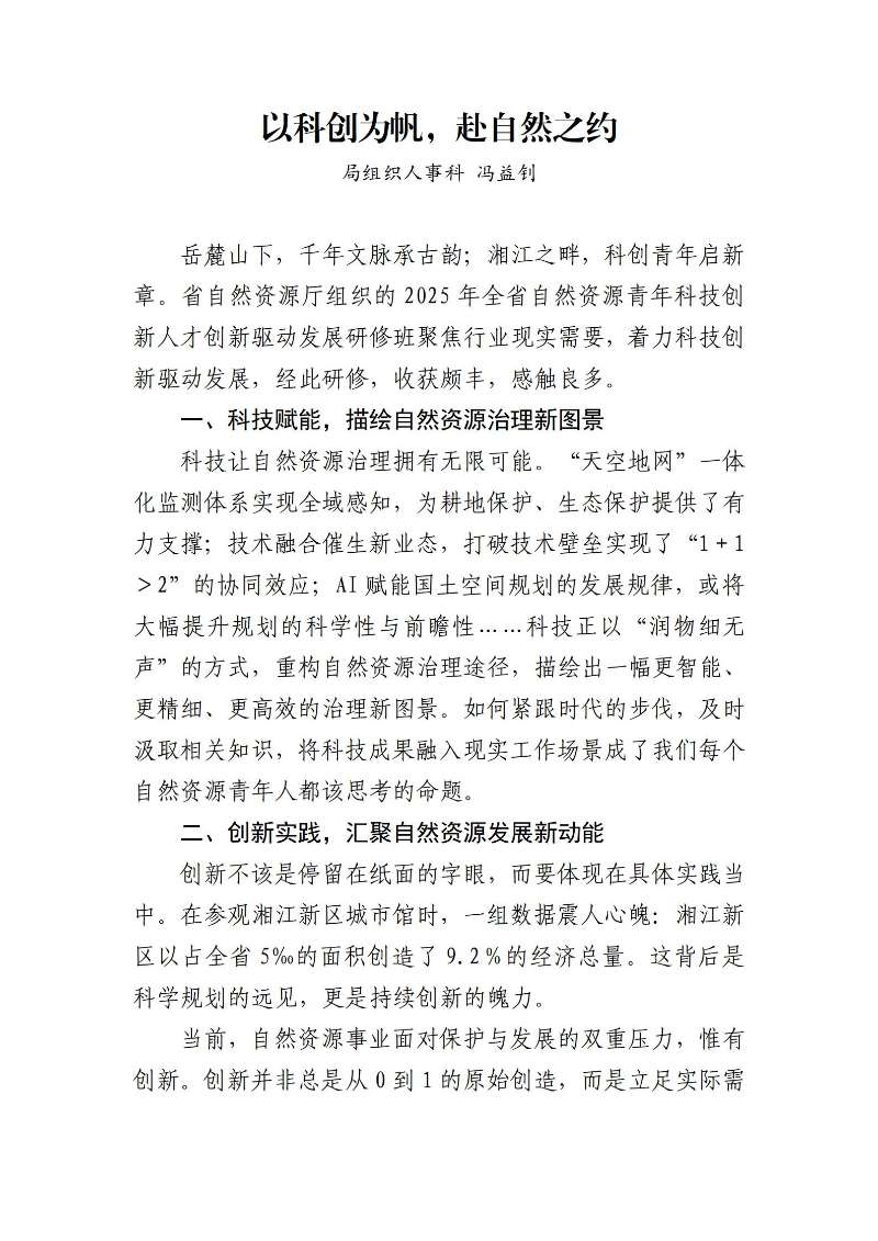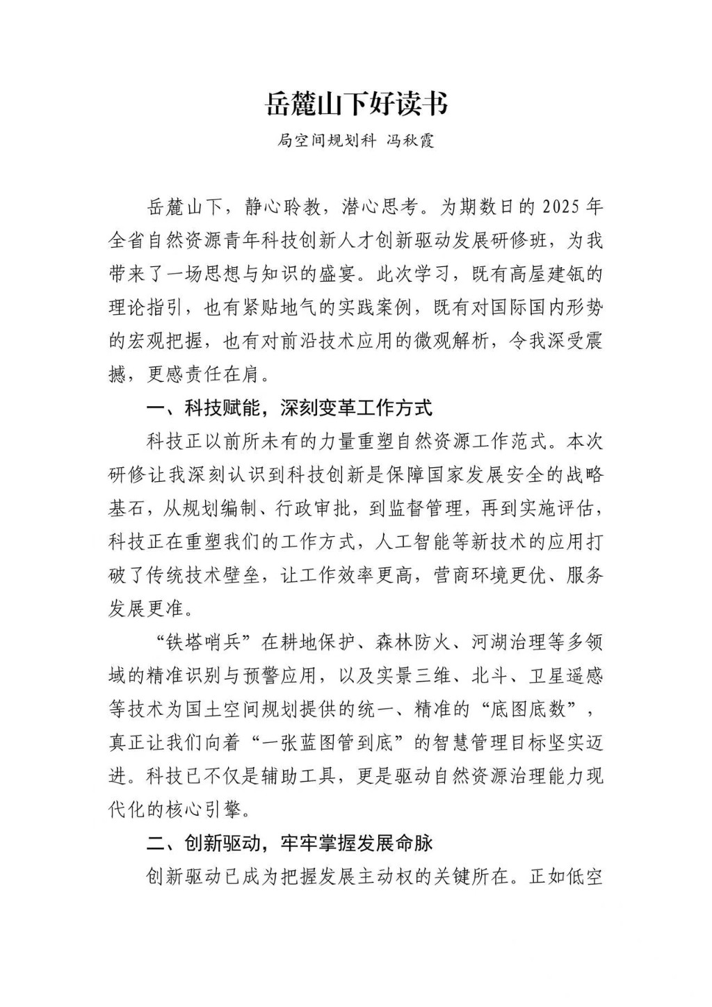 编者按:习近平总书记强调:“创新是引领发展的第一动力”。衡阳市自然资源和规划局党组高度重视科技创新工作,局党组书记、局长王湘淮多次指出,青年是自然资源事业发展的生力军,是推动改革创新的重要力量,青年干部要始终保持昂扬向上、勤学敬业的精神风貌,展现锐意进取、实干笃行的决心担当,从学思践悟中体味自然资源工作情怀。10月19日——29日,2025年全省自然资源青年科技创新人才创新驱动发展研修班在长沙举行,市局安排2名青年代表参与学习研讨。为激励共进,营造浓厚学习氛围,现将2名青年代表学习心得予以刊发,以供参考交流。