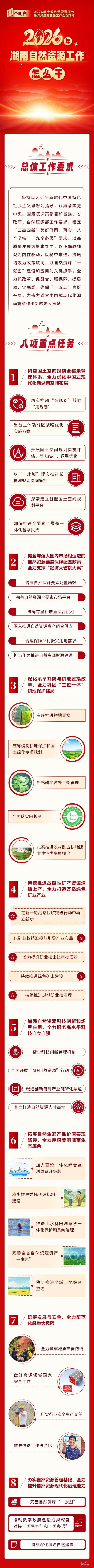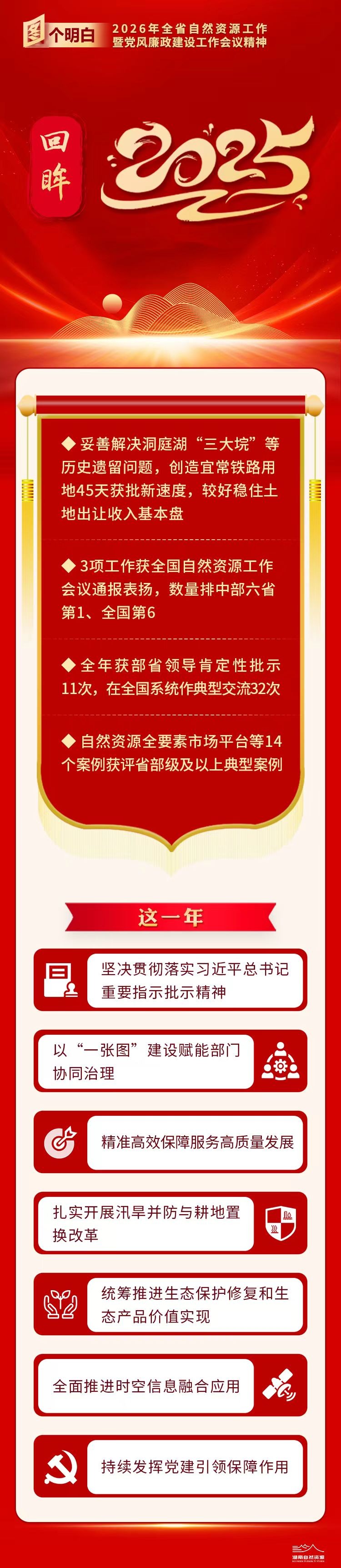 2月25日,2026年全省自然资源工作暨党风廉政建设工作会议在长沙召开,主要任务是:以习近平新时代中国特色社会主义思想为指导,全面贯彻党的二十届四中全会、二十届中央纪委五次全会、中央经济工作会议、中央农村工作会议和全国自然资源工作会议精神,认真落实省委、省政府决策部署,总结“十四五”和2025年工作,表彰先进集体和先进个人,部署2026年自然资源工作和党风廉政建设工作。“十四五”时期全省自然资源工作取得了哪些成效,“十五五”时期有哪些目标任务,2026年湖南自然资源工作怎么干?一起图个明白。