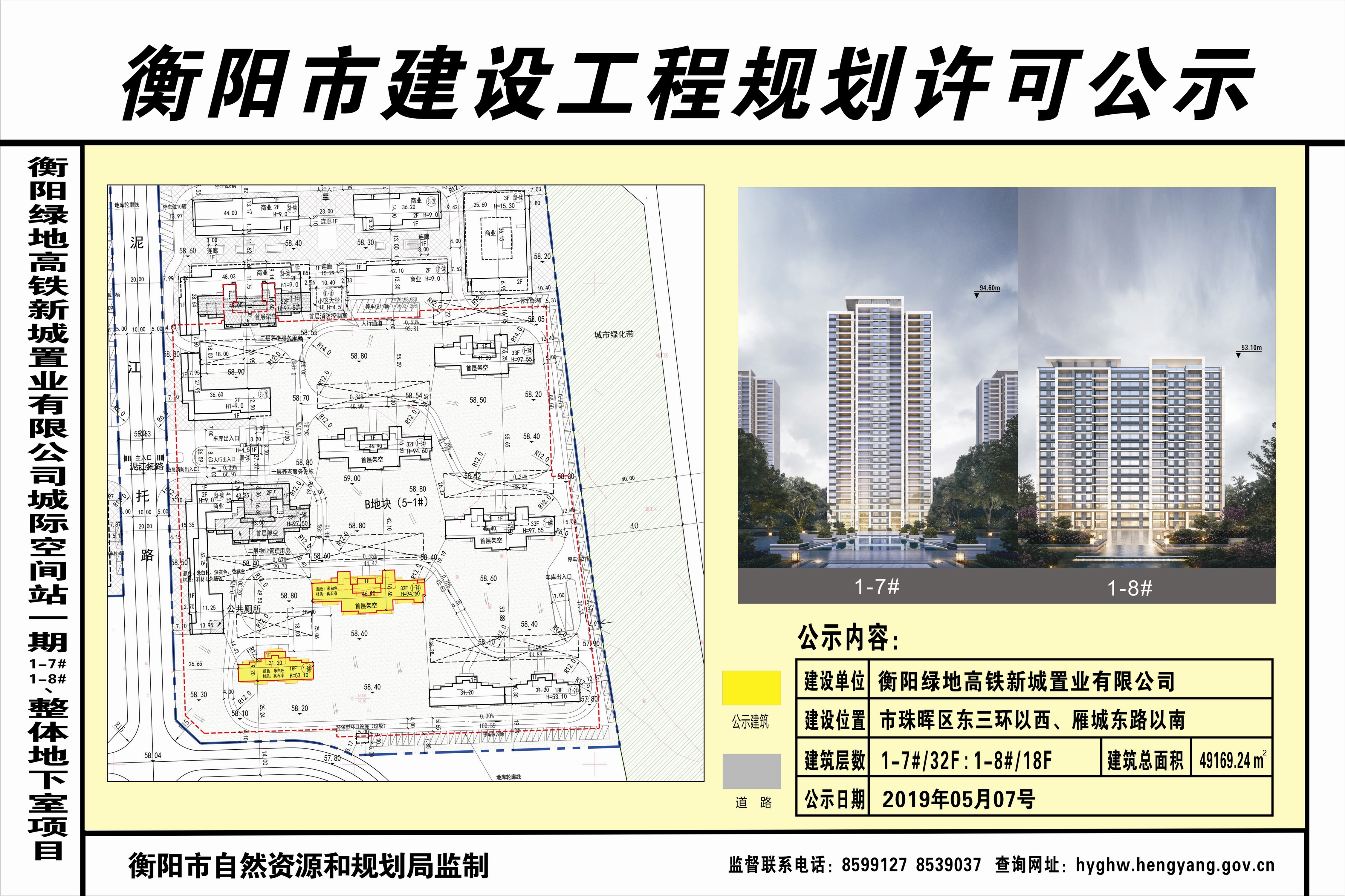 衡阳绿地高铁新城置业有限公司城际空间站一期1-7#、1-8#整体地下室项目工程规划许可公示
