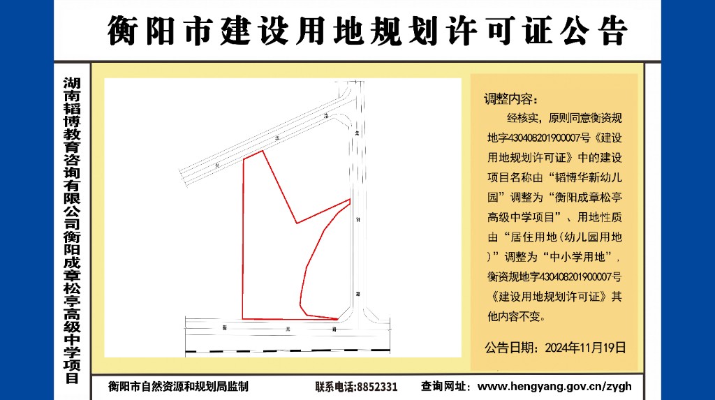 湖南韬博教育咨询有限公司衡阳成章松亭高级中学项目建设用地规划许可证公告
