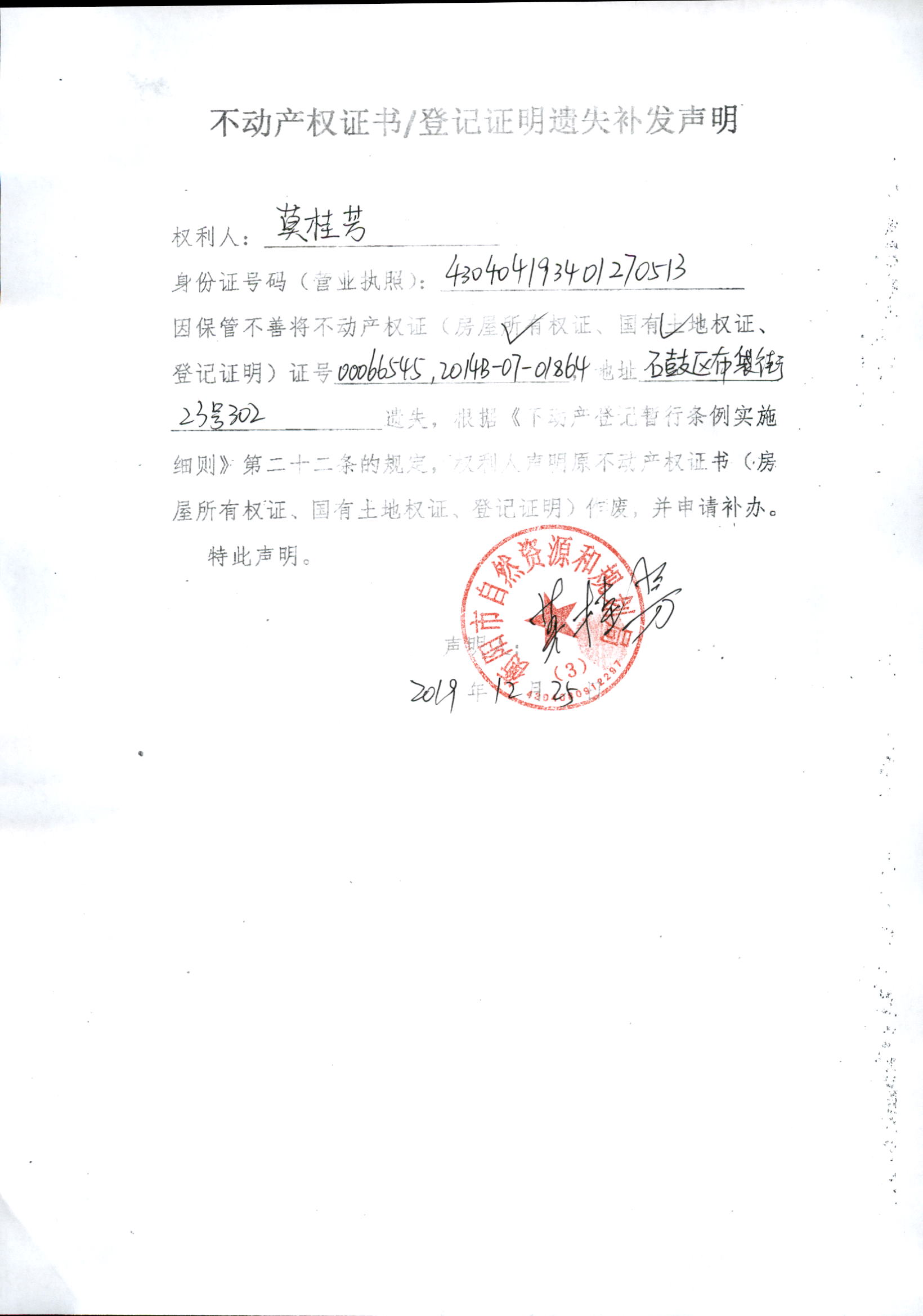 关于莫桂芳房屋所有权证,国有土地权证遗失补发声明