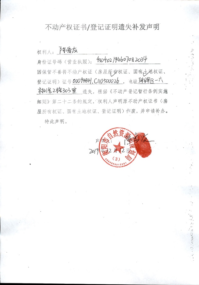 关于陈爱友的房屋所有权证、国有土地权证遗失补发声明