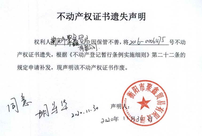 关于衡阳市聚鑫贸易有限公司的不动产权证遗失公告