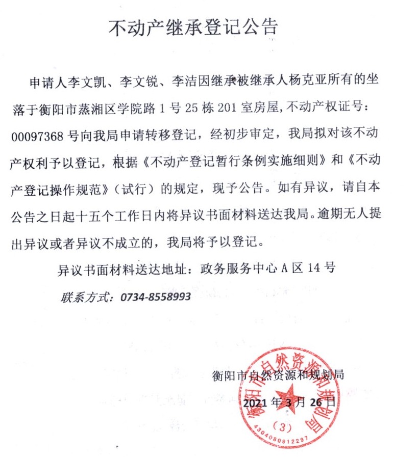 关于李文凯、李文锐、李洁继承杨克亚不动产登记的公告