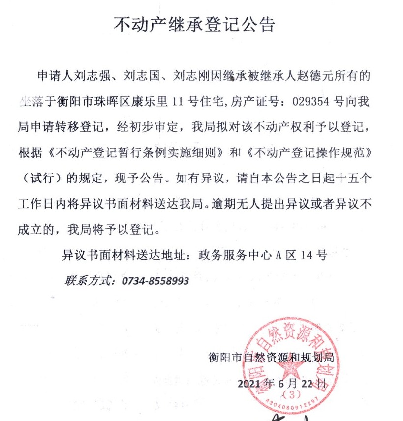 关于刘志强、刘志国、刘志刚继承赵德元不动产登记的公告