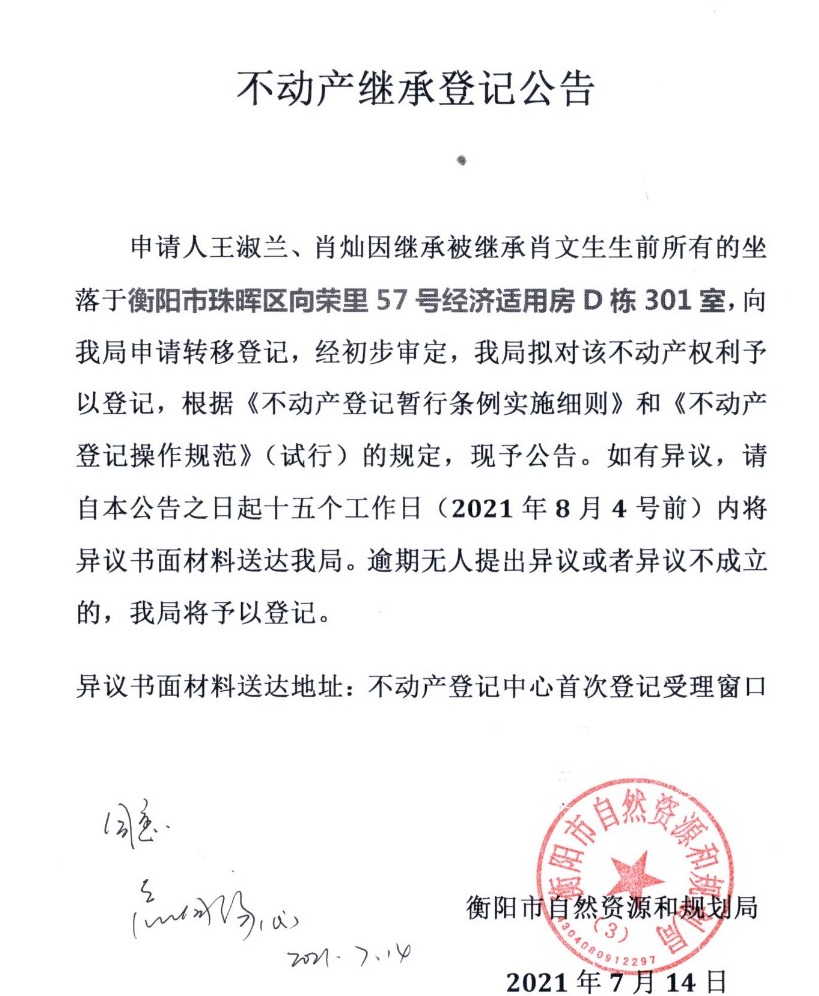 关于王淑兰丶肖灿继承肖文生不动产权的公告