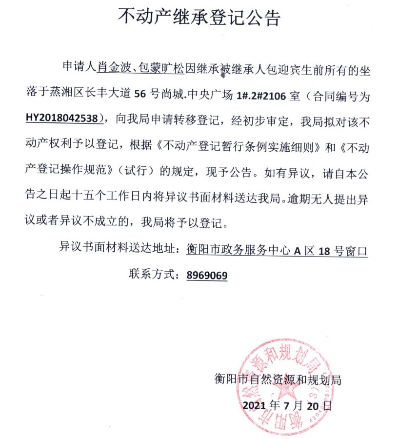 关于包蒙旷松继承包迎宾不动产登记的公告