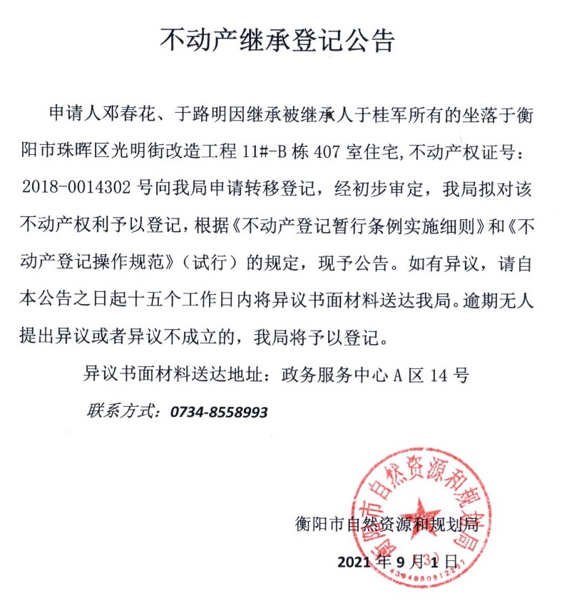 关于邓春花、于路明继承于桂军不动产登记的公告