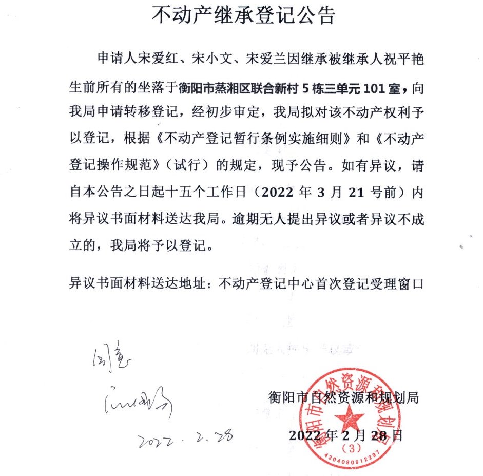 关于宋爱红、宋小文、宋爱兰继承祝平艳不动产登记的公告