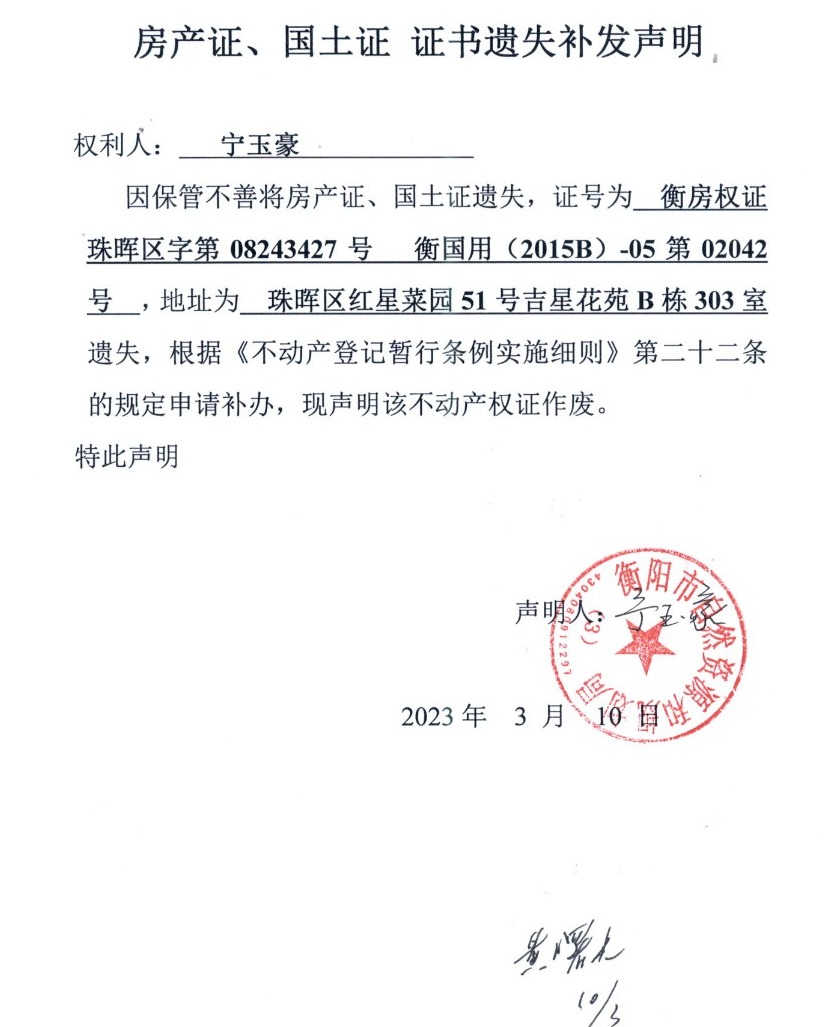 关于宁玉豪房产证、国土证证书遗失补发声明