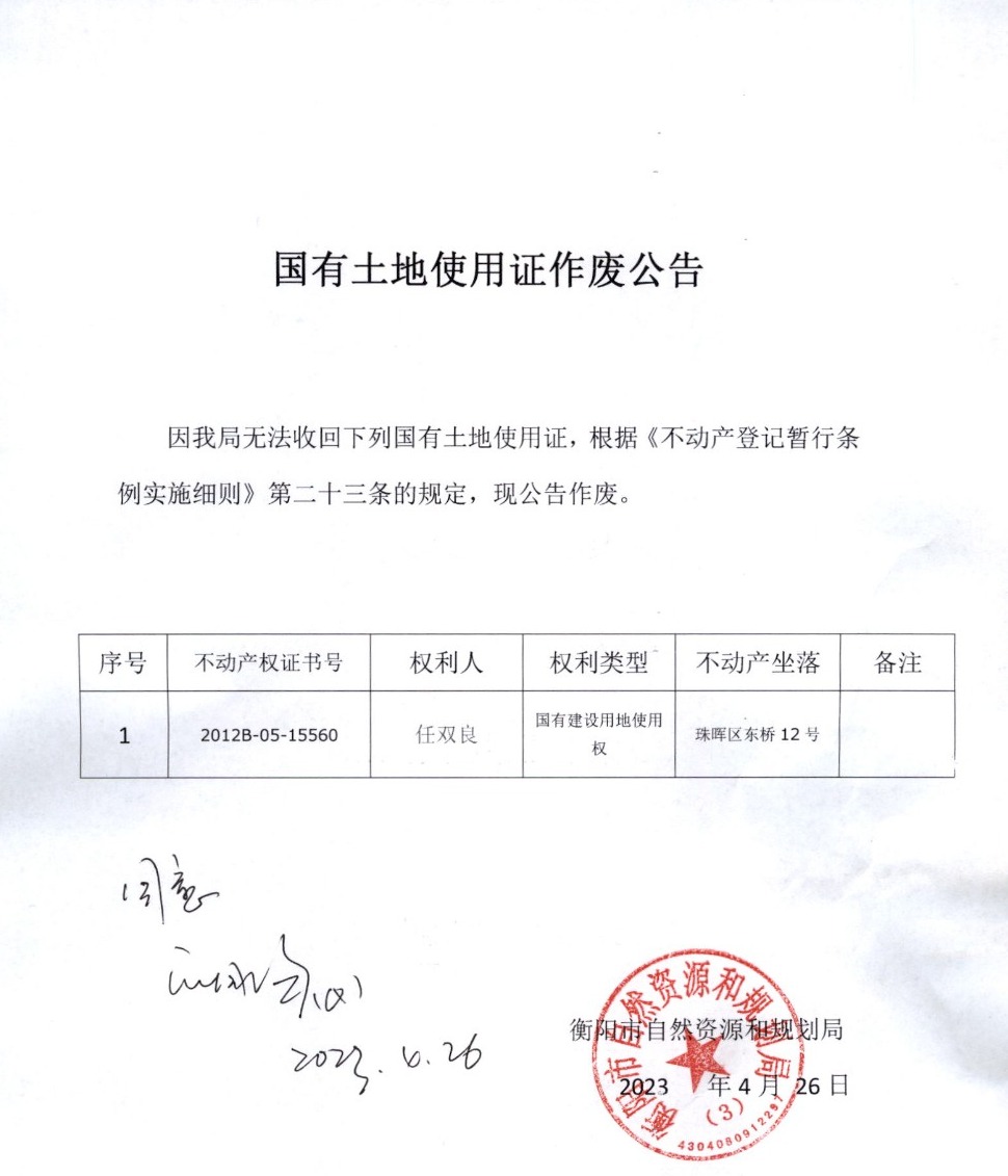 关于任双良国有土地使用证作废的公告