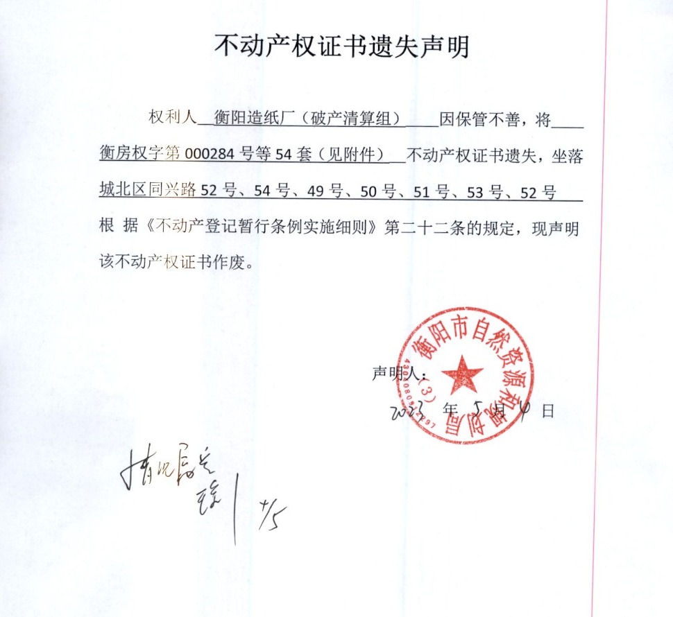 关于衡阳造纸厂(破产清算组)证书遗失声明
