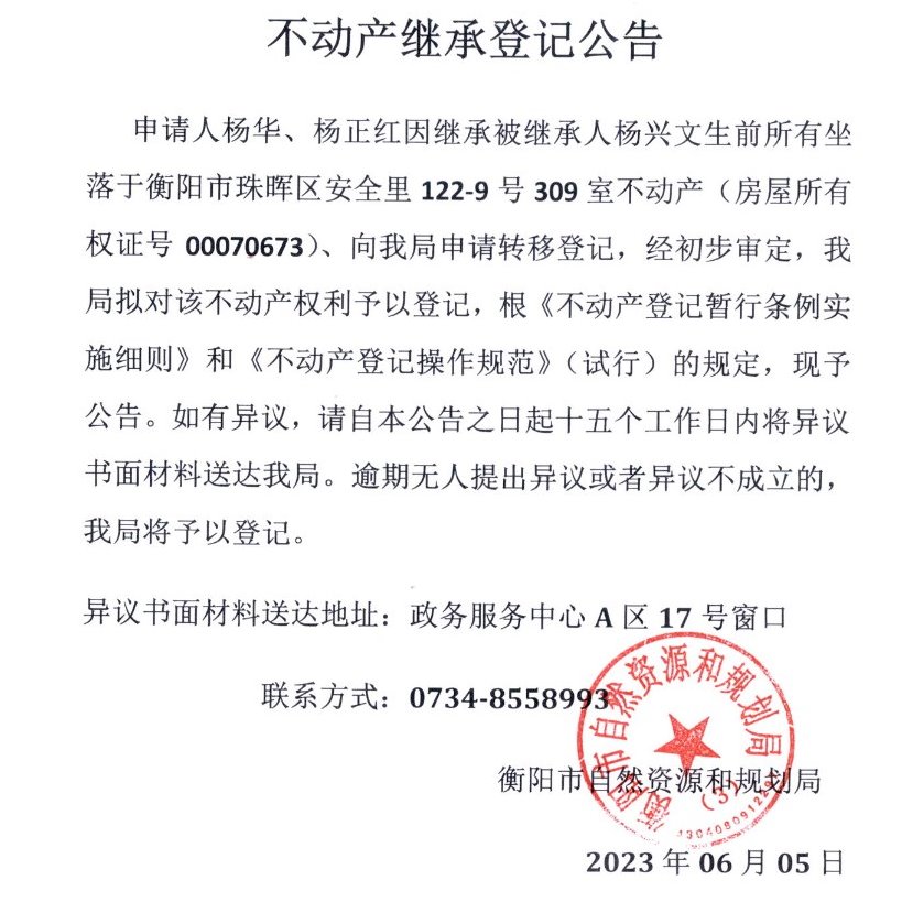 关于杨华、杨正红继承杨兴文不动产登记的公告