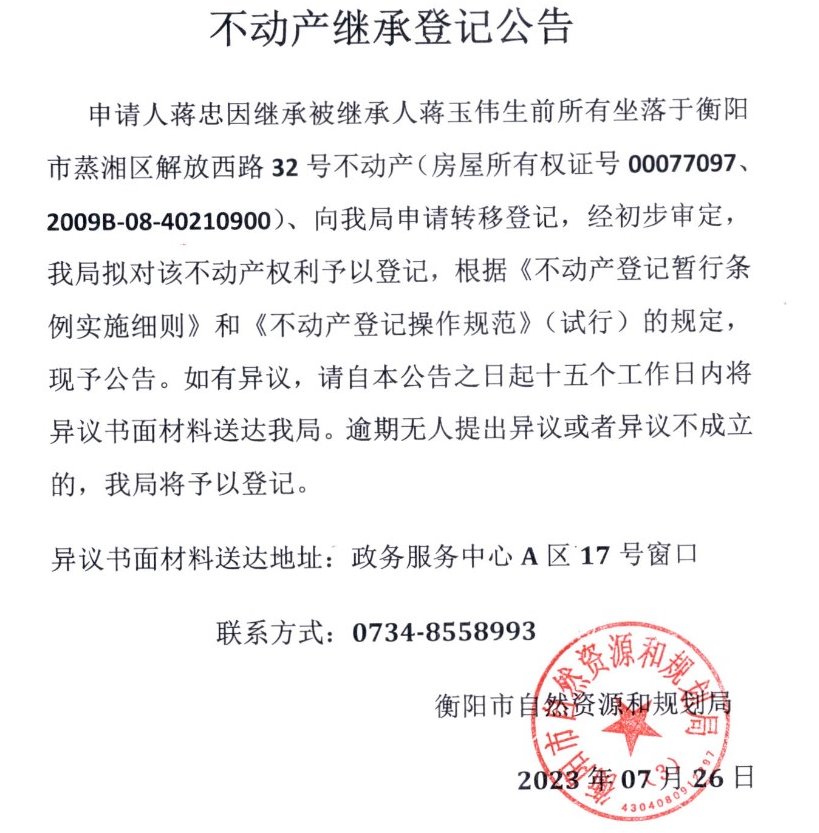 关于蒋忠继承蒋玉伟不动产登记的公告