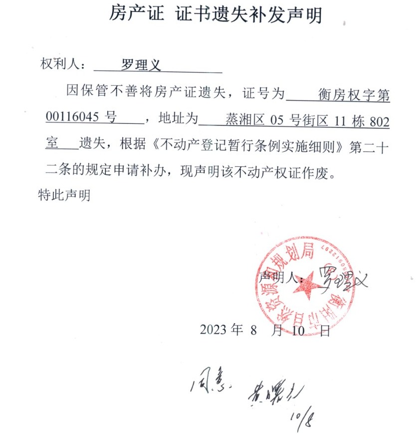 关于罗理义房产证遗失补发声明