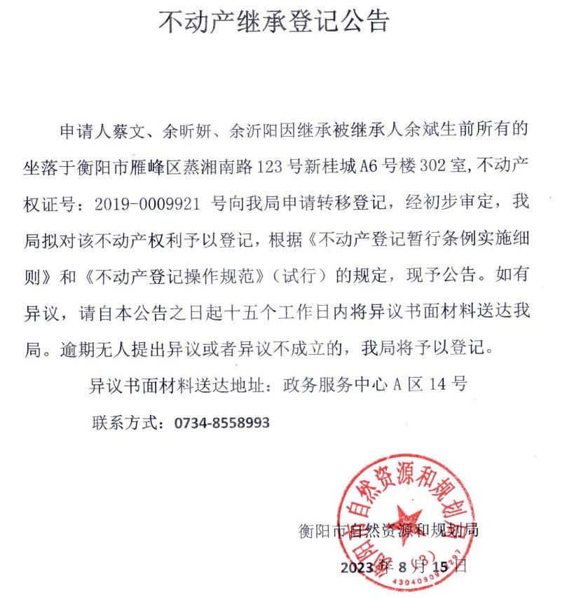 关于蔡文、余昕妍、余沂阳继承余斌不动产登记的公告