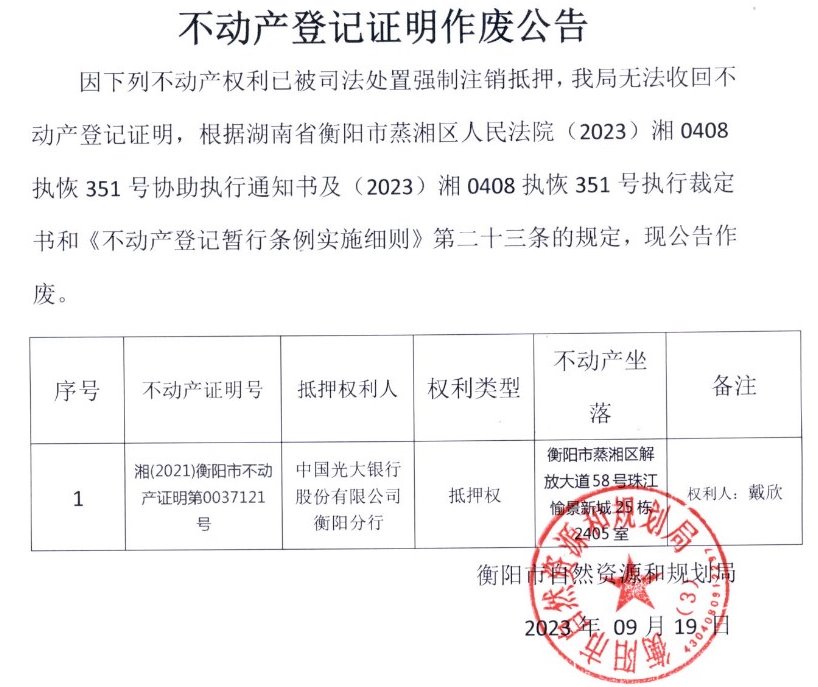 关于中国光大银行股份有限公司衡阳分行不动产登记证明作废的公告