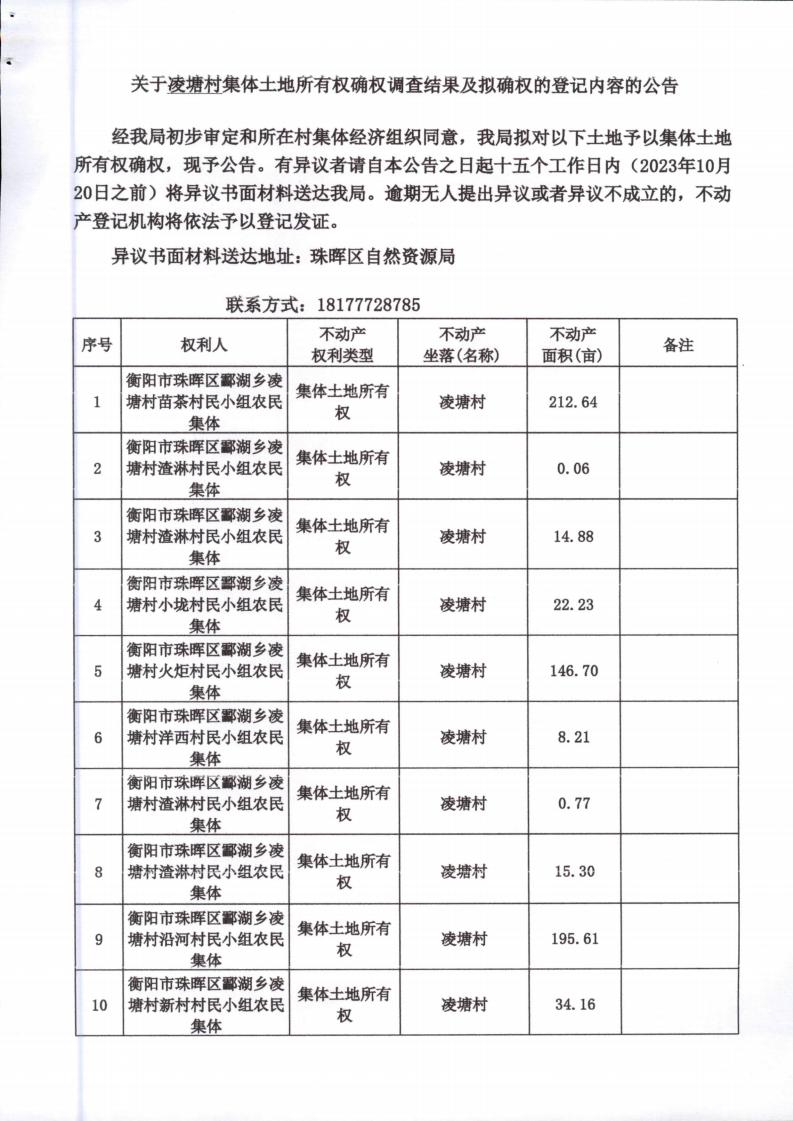 关于珠晖区凌塘村集体土地所有权确权调查结果及拟确权的登记内容的公告