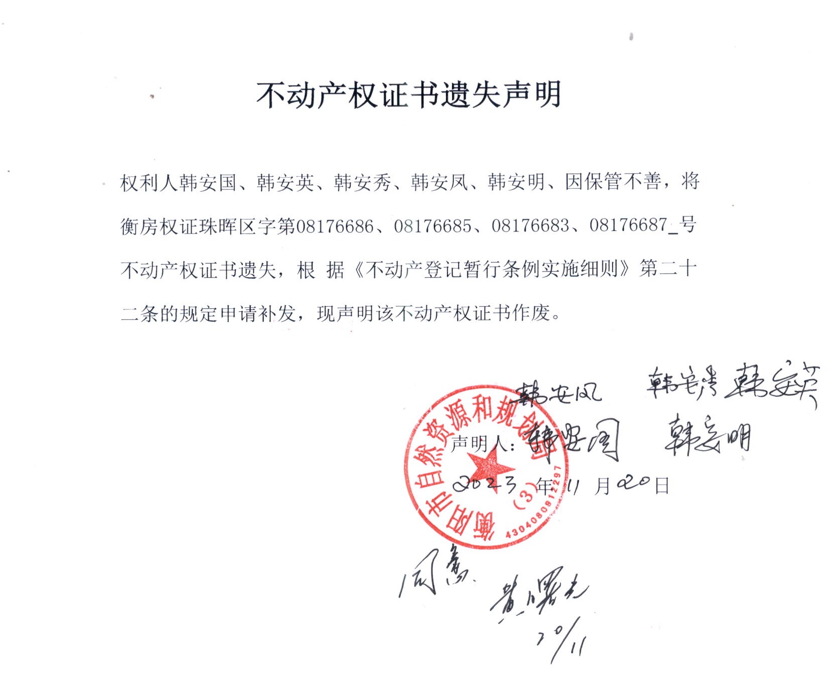 关于韩安国、韩安英、韩安秀、韩安凤、韩安明房产证书遗失声明