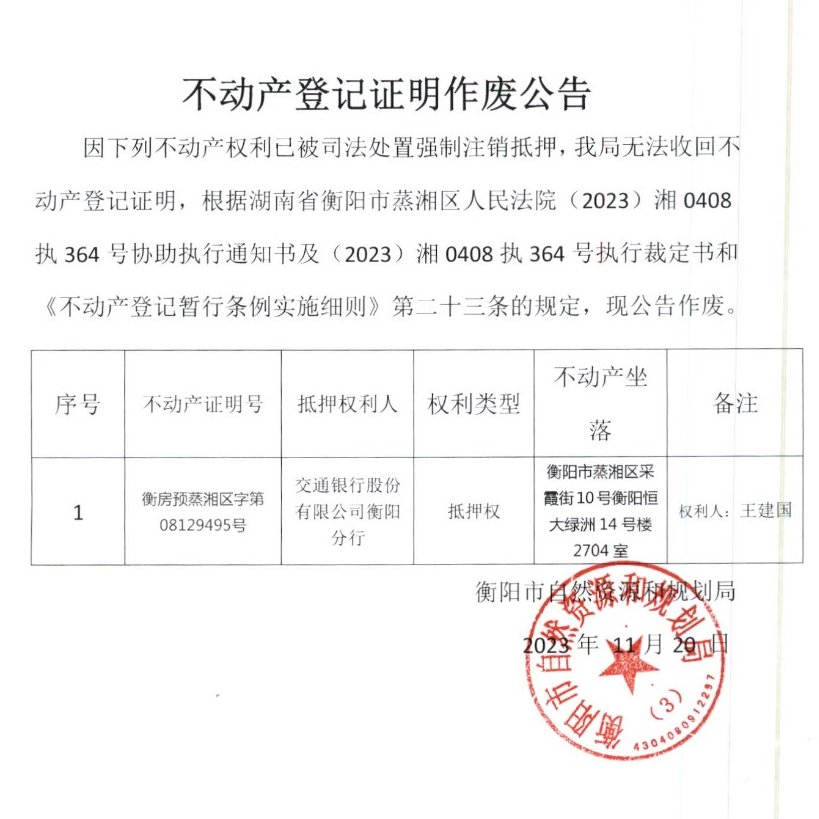 关于交通银行股份有限公司衡阳分行不动产登记证明作废公告