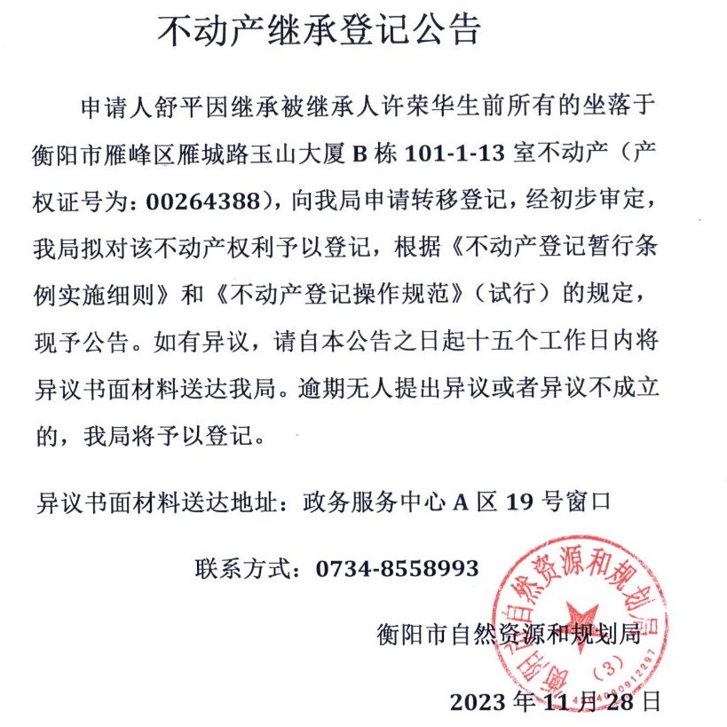 关于舒平继承许荣华不动产登记的公告