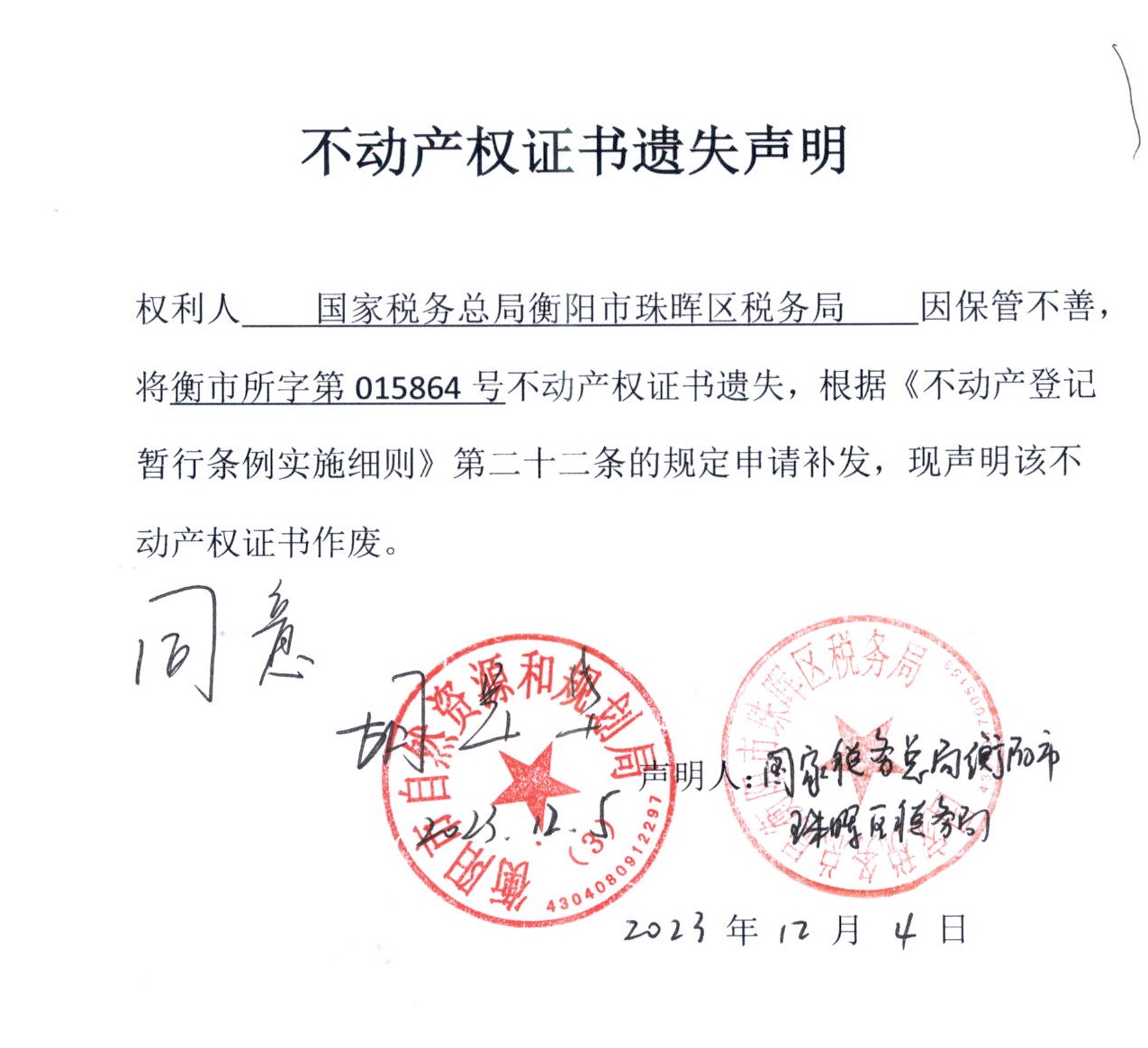 关于国家税务总局衡阳市珠晖区税务局不动产证书遗失声明